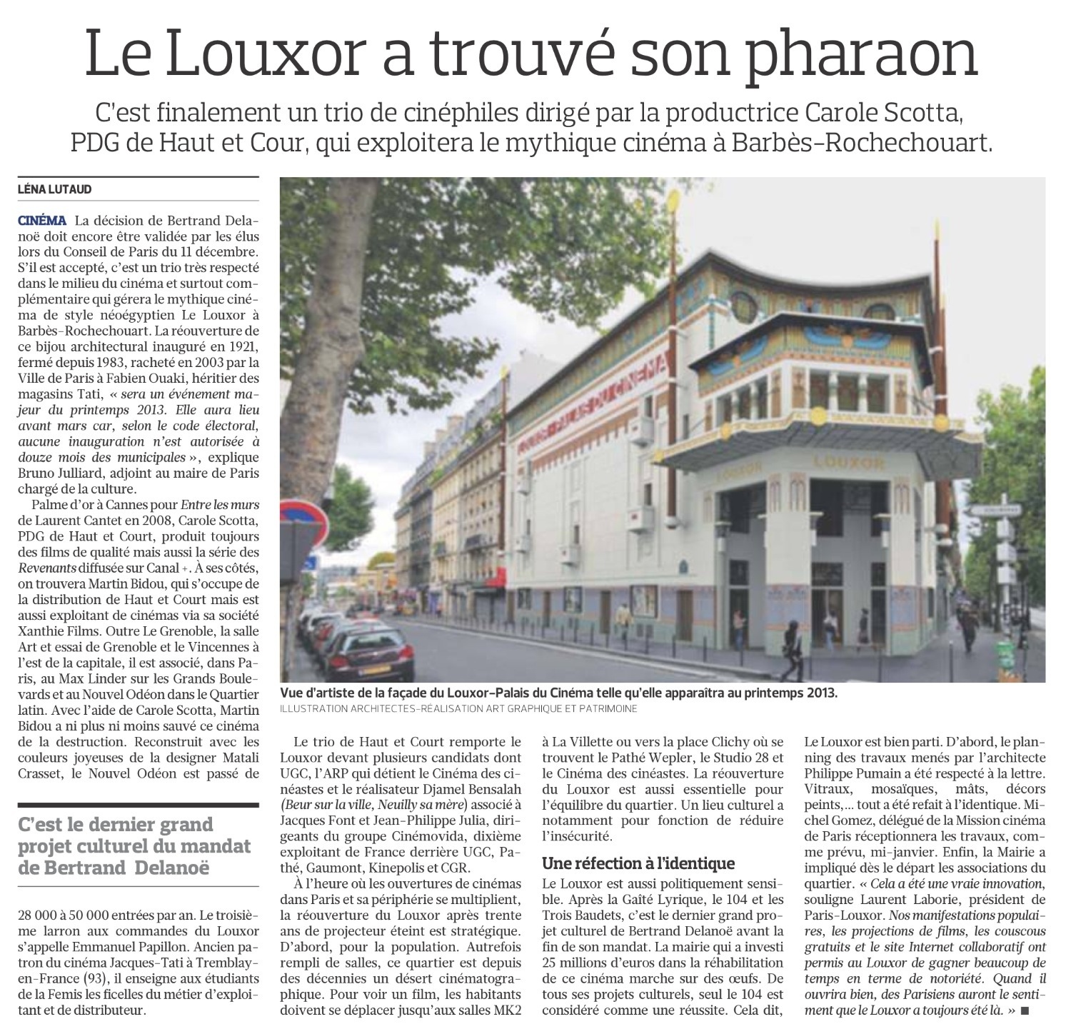 Ce sont, Carole Scotta, productrice de Haut et Court (société indépendante de production et de distribution de films, située rue des Martyrs dans le 9e), Martin Bidou, exploitant du Max Linder (9e), du Vincennes (94) et du Nouvel Odéon (6e, récemment relooké par Matali Crasset) et Emmanuel Papillon, directeur du département Distribution-Exploitation à La Fémis et ancien exploitant du cinéma Jacques Tati de Tremblay en France qui ont été choisis pour la reprise du Louxor. Une société CINELOUXOR a été constituée pour l’occasion, celle-ci regroupe la Holding Haut et Court et la société Xanthie Films et Emmanuel Papillon. La proposition d’attribution pour l’exploitation du Louxor sera examinée lors du prochain Conseil de Paris, le 11 décembre prochain.