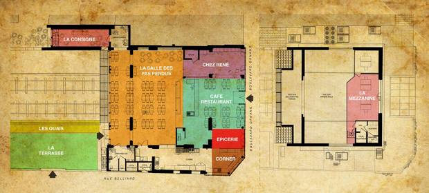 Beau programme donc ! Que la rédaction de Paris-Louxor a découvert lors de sa dernière visite de chantier durant laquelle Stéphane Vatinel a fait part de quelques nouveautés. D’abord, et on s’en doutait un peu, « ici, tout est réhabilité avec des matériaux de récupération ». Sauf cas d’obligation sanitaire comme pour les cuisines où la loi est très stricte quant aux mesures d’hygiène et de sécurité. Mais pour le reste, c’est bien simple, on est au pays de la récup ! Quand le sol en béton n’est pas transformé en faux carreaux de ciment grâce à des pochoirs dessinés pour l’occasion, il est réhabilité avec des planchers récupérés d’anciens wagons. A part les grandes verrières côté quais, qui offriront de gigantesques puits de lumière, les façades ne bougeront pas pour la plupart et resteront même dans leur jus où les briques et cadres fenêtres usés par le temps, donnent des airs de site industriel désaffecté. A l’étage, des cloisons de bric et de broc ont même été reconstituées à partir de matériaux récupérés in situ. Une façon de démontrer les multiples possibilités de la réutilisation des objets même quand, a priori, ils sont loin de leur destination première. Entre tour de force et de magie, l’atmosphère bon enfant mais responsable est de mise.