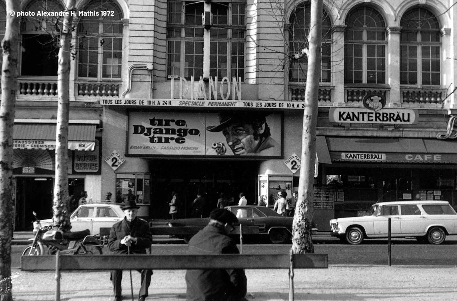 Photo du Trianon : © photo Alexandre H. Mathis 1972. A l’affiche, western spaghetti italien, « Tire, Django, tire » (1968) de Frank B. Corlish (aka Bruno Corbucci).